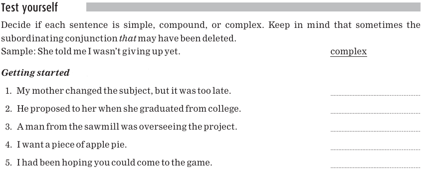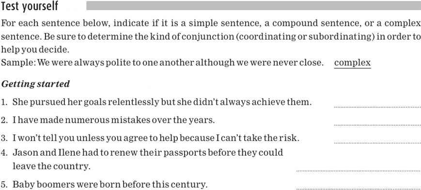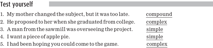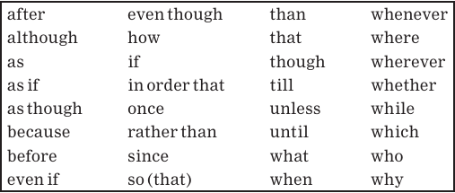 Recall that, in a compound sentence, the clauses are joined by a coordinating conjunction such as and, or, and but. In a complex sentence, the dependent clause is joined to the rest of the sentence by a subordinating conjunction. The common subordinating conjunctions of English are repeated here for reference.