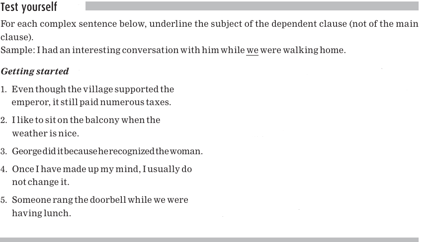 Sentences 2-4 also each contain two sentences, or clauses, which are combined to make a larger sentence. However, one of these sentences is more important than the other. The more important sentence is called the main clause, or independent clause; the less important sentence, the one that is a subpart of the main clause, is called the dependent clause or subordinate clause. Each clause, whether it’s a main clause or subordinate clause, has its own subject and verb phrase. Sentences that contain a main clause and at least one dependent clause are called complex sentences.