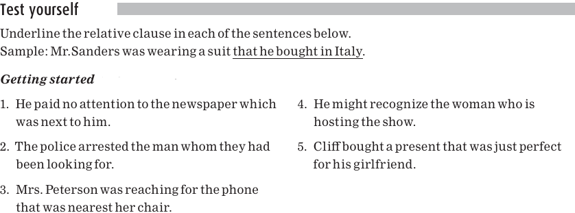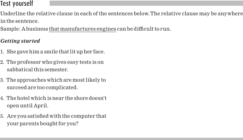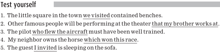 In each sentence below, the relative clause is underlined, and the noun phrase which the relative clause is modifying is in bold. The main clause can stand on its own as a sentence without the relative clause; the relative clause just provides additional information about the noun phrase it’s modifying and cannot stand alone. Like other clauses, a relative clause has its own subject and verb phrase.
