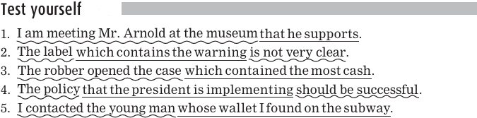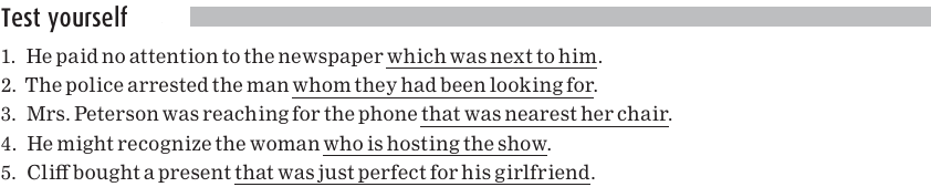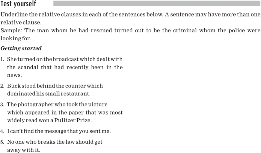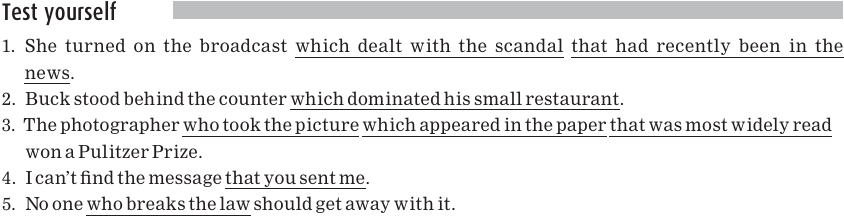 We’ve seen (in Complex sentences) that other dependent clauses are linked to the rest of the sentence by subordinating conjunctions. The same is true of relative clauses. Those subordinating conjunctions which link relative clauses to the rest of the sentence are called relative pronouns, and you may remember that we talked about them earlier. The relative pronoun which introduces the relative clause is underlined in the sentences below: