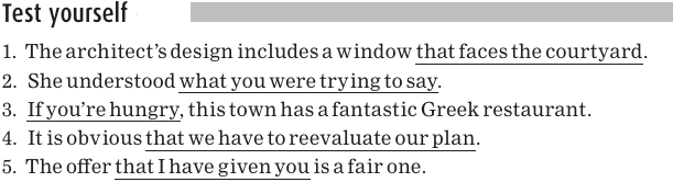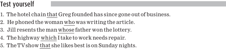 Relative clauses begin with one of the relative pronouns: that, which, who, whom, whose.