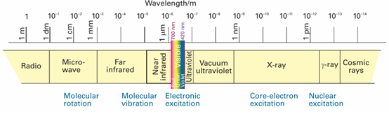 where ρ (rho), the density of states, is the proportionality constant between dλ and the energy density, dE, in the range of wavelengths between λ and λ + dλ, k is Boltzmann’s constant (k = 1.381 × 10−23 J K−1). The units of ρ are typically joules per metre4 (J m−4), to give an energy density dE in joules per cubic metre (J m−3) when multiplied by a wavelength range dλ in metres. A high density of states at the wave length λ simply means that there is a lot of energy associated with wavelengths lying between λ and λ +dλ. The total energy density (in joules per cubic metre) in a region is obtained by integrating eqn 8.3 over all wavelengths between zero and infinity, and the total energy (in joules) within the region is obtained by multiplying that total energy density by the volume of the region.