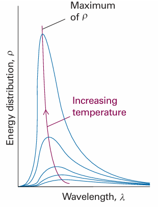 Fig. 8.3 The energy distribution in a black body cavity at several temperatures. Note how the energy density increases in the region of shorter wavelengths as the temperature is raised, and how the peak shifts to shorter wavelengths. The total energy density (the area under the curve) increases as the temperature is increased (as T4).