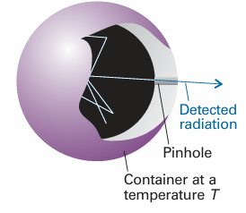 Fig. 8.4 An experimental representation of a black-body is a pinhole in an otherwise closed container. The radiation is reflected many times within the container and comes to thermal equilibrium with the walls at a temperature T. Radiation leaking out through the pinhole is characteristic of the radiation within the container.