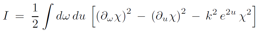 The correspondence between the momentum vector k and the angular momentum ℓ is given by the usual connection between momentum and angular momentum. If the horizon has circumference 2π(2MG), then a wave with wave vector k⊥ will correspond to an angular momentum |ℓ| = |k| r = 2MG|k|. Thus the potential in equation 1.6 is seen to be proportional to ℓ2. For very low angular momentum the approximation is not accurate, but qualitatively is correct for ℓ > 0.I n approximating a sum over ℓ and m by an integral over k, the integral should be infrared cut off at |k| ∼ 1/MG. From the action in equation 1.5 we obtain the equation of motion