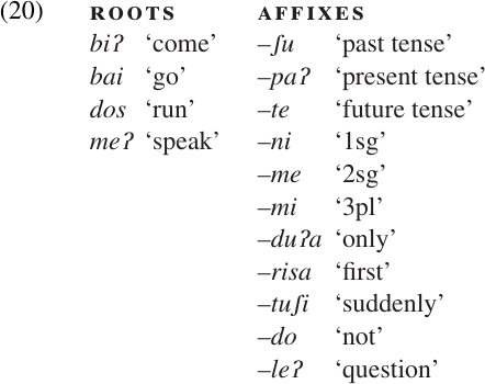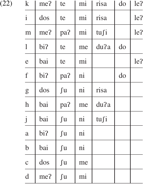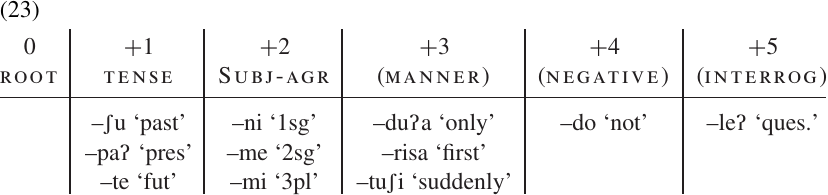 In our present example, we can see that the three tense markers (–ʃu,–paʔ, and–te) form a coherent group, as do the three subject-agreement markers (–ni,–me, and–mi); and there are no words which contain more than one element from either group. So our initial chart might look like (21).