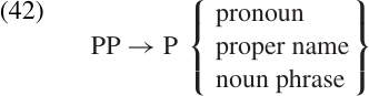 In the same way, the object of a preposition can be a pronoun, a proper name, or a common noun phrase, as illustrated in (41). Again, we could build this set of alternatives into the Phrase Structure rule which generates our prepositional phrase as in (42).