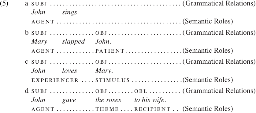 In any particular sentence in which these verbs are used, each of the arguments will be associated with a specific Grammatical Relation. This is illustrated in (5), where both the semantic role and the Grammatical Relation are marked for each argument.