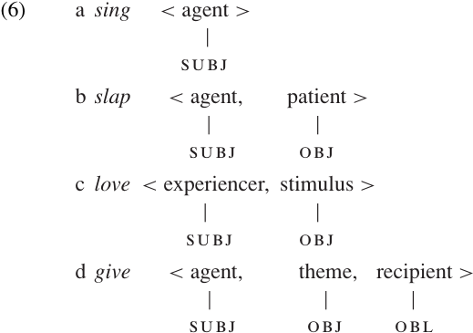 We should point out that the representations in (6) are somewhat redundant, in that they contain information that is (usually) predictable. For example, a normal active transitive verb will almost always assign the SUBJ relation to its agent and the OBJ relation to its patient. Many linguists assume that a lexical entry should contain as little redundant or predictable information as possible. Now if the Grammatical Relation of each argument were fully predictable, so that it could be determined by applying a set of rules (often called LINKING rules), then we would not need to list the Grammatical Relations in the verb’s lexical entry. However, getting this approach to work properly turns out to be a fairly difficult task, and introduces more complexity than we can deal with here. For this reason, we will simply assume that all of the information contained in the representations in (6) is specified in the lexical entry for each verb.