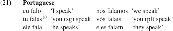 Portuguese is another language in which the verb agrees with its subject. Unlike English, Portuguese verbs show agreement marking in all persons and most tenses. Only the present tense forms are listed in (21).