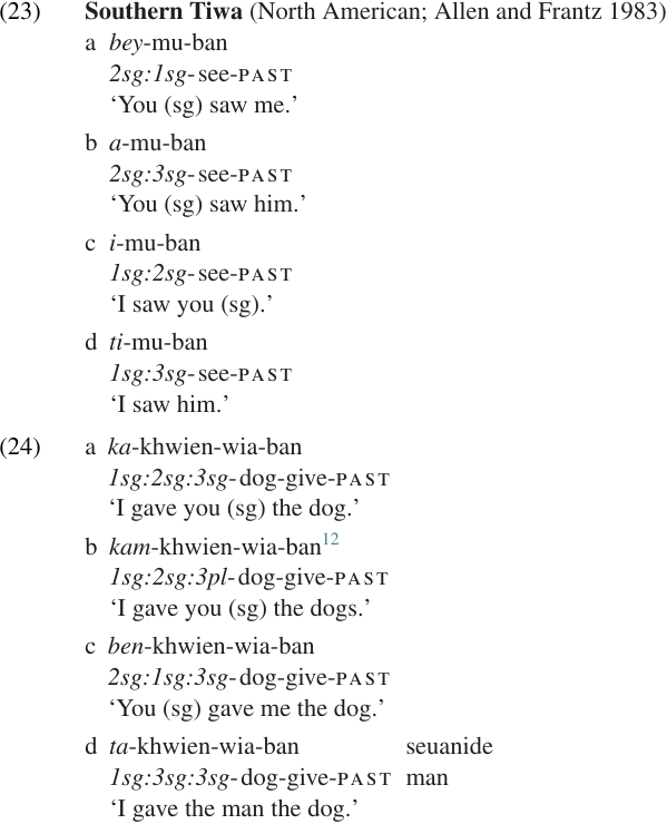An example of a language which agrees with subject, primary object, and secondary object is Southern Tiwa.11 Agreement with these three arguments is shown in a single portmanteau prefix, as illustrated in (23–24).