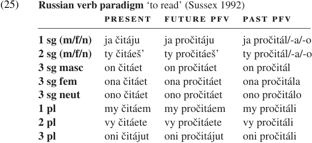Nahuatl (or Aztec), from Mexico, is a language in which a transitive verb agrees with both subject and direct object, as illustrated in (22b). An intransitive verb, of course, agrees only with the subject (22a). Notice that, in addition to the agreement prefixes which register the person and number of the subject and object, the verb also bears a plural agreement suffix-(e)h when the subject is plural. The agreement affixes are summarized in the chart in (22c).