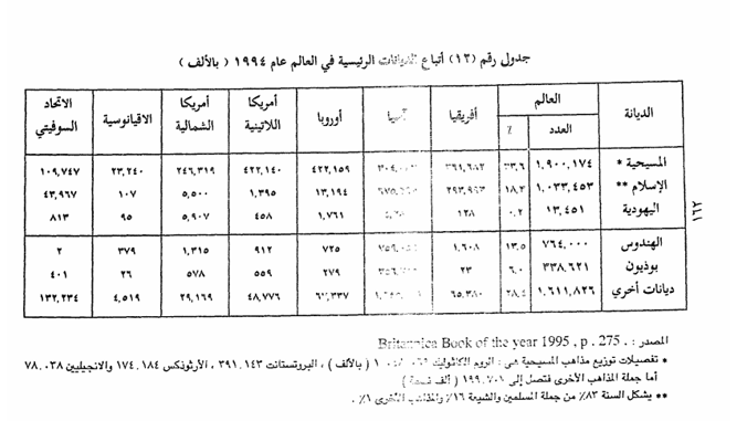 ومن الجدير بالذكر أن الديانات والعقائد التي توجد في العالم كثيرة ومتعددة ، فإلى جانب الديانات الكتابية الثلاثة : الإسلامية والمسيحية واليهودية توجد عديد من المعتقدات الوضعية ، وفي عام 1972 قدر الكتاب السنوى لدائرة المعارف البريطانية أن عدد سكان العالم يصل إلى 3552 مليون نسمة منهم 4 985 مليونا يدينون بالمسيحية بنسبة (27%) و 3 , 471 مليون يدينون بالإسلام ( بنسبة 13,3) و 145 مليون يهودى بنسبة 4% من سكان العالم أما النسبة الكبرى الباقية (20808) مليون بنسبة 58,6% فأنهم يتبعون ديانات أخرى وضعية أو بدائية ، ومن أهم هذه الديانات الوضعية الهندوكية وأتباعها 4724 مليون والكونفوشيوسية وأتباعها 3045 مليون نسمة والبوذية وأتباعها 301 مليون نسمة.