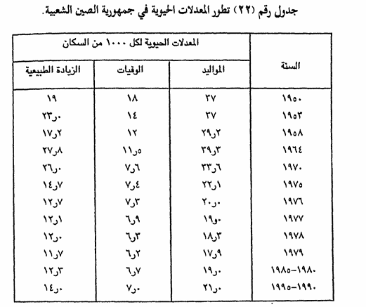 ويظهر من الجدول رقم (22) أن معدلات المواليد لم تبدأ فعليا في الانخفاض في الصين إلا بعد عام 1970 وأن معدلات الوفيات قد انخفضت في مرحلة تسبق انخفاض معدلات المواليد مما أدى إلى أن معدلات الزيادة الطبيعية كانت مرتفعة في الفترة بين أعوام 1964 - 1870، ثم أدى نجاح الحملتين الأخيرتين إلى إخفاض معدلات الزيادة الطبيعية.