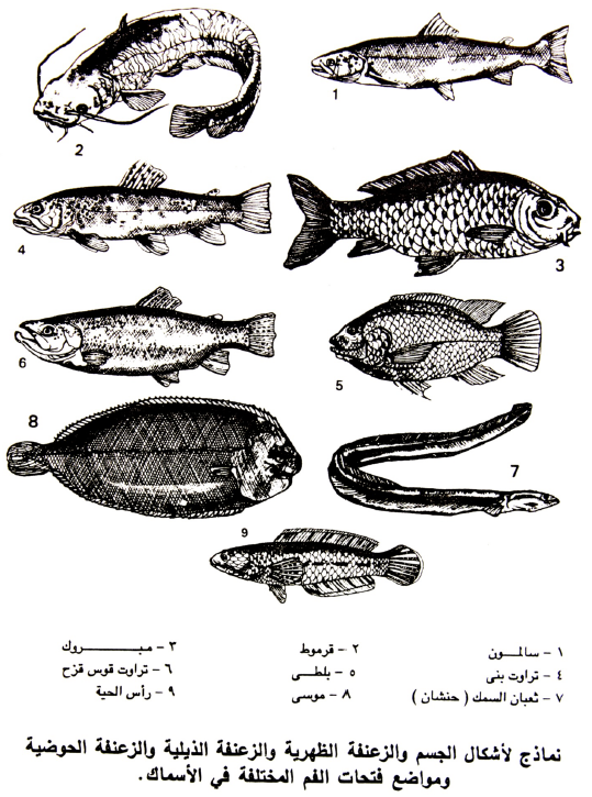 د- من حيث موقع فتحة الفم وتركيبة: فالأسماك اما ان تكون فتحة فمها سفلية او تحت سفلية او امامية او علوية.