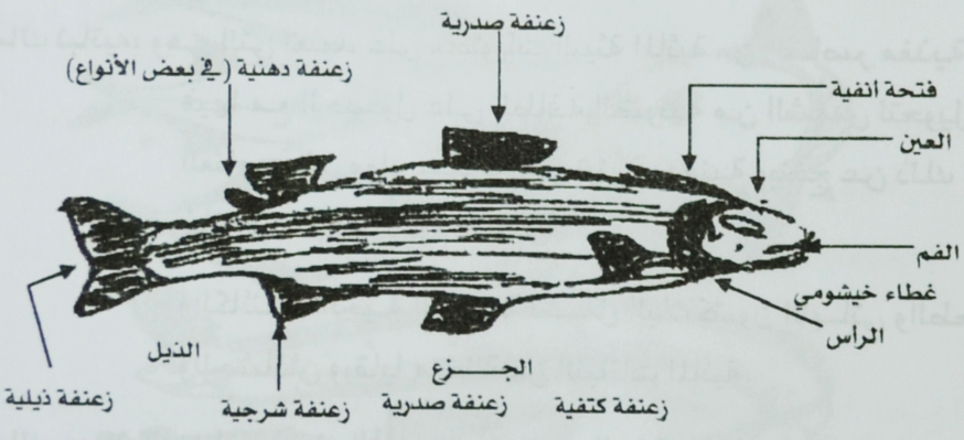 يتكون جسم السمكة من ثلاث اجزاء رئيسية هي: الراس والجذع والذيل. يحتوي الراس على الفم والعينين والفتحة الانفية. ويحتوي الجذع على اجزاء الجسم المختلفة ويحمل انواع من الزعانف المختلفة منها ظهرية وصدرية وبطنية وشرجية وذيلية ودهنية. والشكل يوضح هذه الاجزاء: