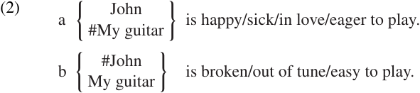 The examples in (2a,b) also involve selectional restrictions, but with an interesting difference: the same verb is used in all of these examples, namely is. This shows that, unlike previous examples we have considered, the contrast between John is in love vs. #My guitar is in love, or #John is easy to play vs. My guitar is easy to play, etc. cannot be determined by the lexical properties of the verb itself. Rather, the words or phrases that follow the verb seem to determine the selectional restrictions on the subject of the clause.