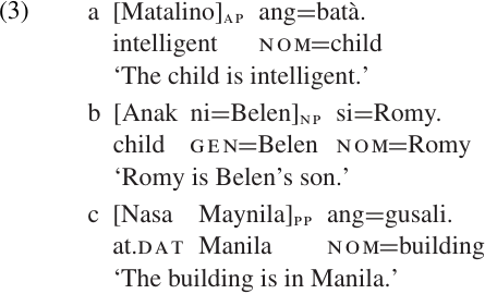 The linking verb contributes very little to the meaning of a sentence, but it does satisfy a basic requirement of English grammar which states that every sentence must contain a verb. This requirement does not hold for all languages, however. In a number of languages, sentences like those in (2) would be expressed without any verb at all. Some Tagalog examples are presented in (3).1 The semantic predicates of these three sentences are expressed by phrases belonging to the categories AP, NP, and PP, respectively. (In a Tagalog verbal clause, the verb usually comes first; in non-verbal clauses, the predicate phrase normally comes first.2) In each case the English translation contains the linking verb is, but there is no corresponding form in the Tagalog.