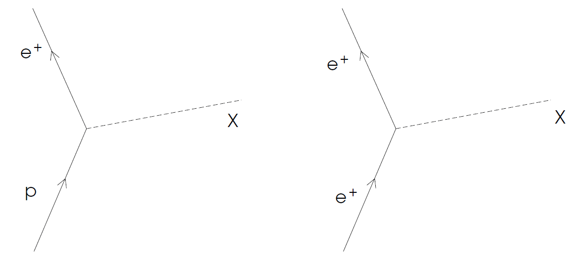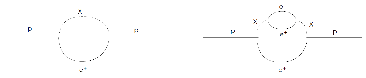 Fig. 1.1. Feynman diagrams of p→ Xe+ and e+ → Xe+.