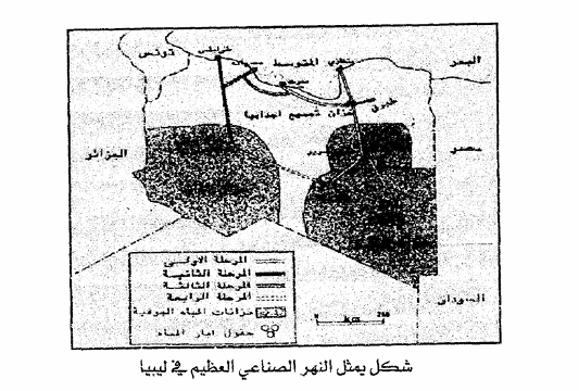 وفي عام 1991م تم الانتهاء من بناء أنبوبين بقطر 4 أمتار لكل منهما، يصلا حقل السرير الذي يحتوي على 15 بئراً ، وحقل تازريو، الذي يحتوي على 120 بئراً مائياً بخزان ضخم سعته 4 ملايين متر مكعب من الماء عند اجدابيا ، ومن هناك تم مد أنبوبين أحدهما إلى بنغازي ، بطول 159 كم ، والآخر إلى سرت ، بطول 40كم ، وقد وصلت المياه إلى بنغازي عام 1991م ، وقد تم الانتهاء من انجاز هذه المرحلة ، والتي تعتبر أكبر مرحلة في المشروع خلال أعوام وسيتم نقل مياه جبل الحساونة في الجنوب إلى طرابلس ، خلال خمسة أعوام في المرحلة الثانية من المشروع ، وفي المرحلة الثالثة ، سيتم ربط جبل الحساونة بالكفرة وتازريو، وتتضمن المرحلة الرابعة من المشروع نقل المياه إلى منطقة طبرق، وأخيراً ومن خلال المرحلة الخامسة سيتم ربط شبكة المشروع بمنظومة واحدة تربط مختلف أنحاء ليبيا ، وقد احتفلت ليبيا بالانتهاء من المرحلة الثانية للنهر الصناعي العظيم، والتي أوصلت المياه إلى طرابلس في 9/1/ 1996م.