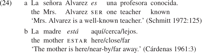 Spanish has two distinct copular verbs, ser and estar. The choice of which copula to use depends partly on the category of the predicate complement and partly on semantic factors. Ca̒rdenas (1961) states that ser is always used when the predicate complement is an NP, as in (24a), while estar is always used when the predicate complement is an adverbial element, as in (24b).