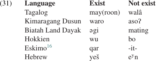 As noted above, Tagalog has two existential predicates: the positive may (or mayroon) and the negative walâ. The negative existential is different from the various negatives used in other contexts. Again, a number of other languages also have special negative existential forms. Some examples from various languages are shown in the following table: