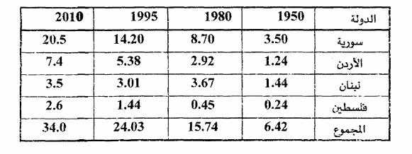 الجدول التالي يبين الزيادة في عدد السكان في بلاد الشام ما بين 1950 حتى 2010.