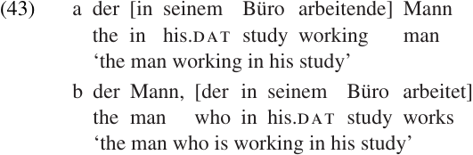 Another common pattern is for the verb inside the modifying clause to appear as a PARTICIPLE. German has two kinds of relative clauses: a prenominal relative containing a participial form of the verb (43a); and a postnominal relative containing a normal finite verb form (43b). Note that English also allows participial relatives, as illustrated in the translation of (43a).