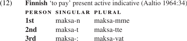 Inflectional morphology is often organized in paradigms, while derivational morphology is not. A PARADIGM can be defined as a set of forms which includes all of the possible values for a particular grammatical feature. For example, the table in (12) illustrates the subject-agreement paradigm in Finnish. The six verb forms in the table differ only in the categories of person and number; the categories of tense, voice, and mood remain constant. There is one suffix representing each possible combination of person and number, and no verb contains more than one of these suffixes. This illustrates the general principle that affixes which belong to the same paradigm are (normally) mutually exclusive (i.e. they cannot co-occur).