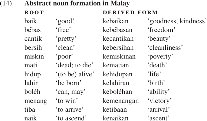 Perhaps the most common such process is the formation of abstract nouns, which is illustrated in (14) using data from Malay. A process that derives nouns from roots or stems belonging to some other category, as in (14), is referred to as NOMINALIZATION. An affix which triggers such a change is called a NOMINALIZER. Notice that the nominalizing affix in (14) is actually a CIRCUMFIX, ke-...-an. When this nominalizer combines with an adjective root, it forms a noun that refers to the state or quality named by the adjective. When it combines with a verb root, it forms a noun that refers to the event or process named by the verb.