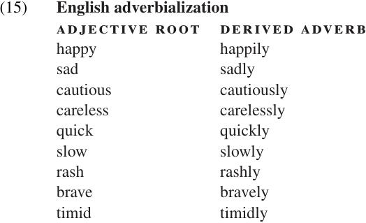Another example of a derivational affix that (often) changes only the syntactic category of its base is the English suffix–ly, which can be used to derive adverbs from adjectives with little or no change in meaning: