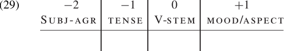 Examples like these are not uncommon, but they are difficult to deal with in any satisfying way in a position class chart. Multiple occurrences of the same affix, or variable ordering with respect to other affixes, would force us to assign a single affix to more than one position class. For these reasons, it is often more helpful to show only the inflectional categories in our position class chart. A possible chart for Chichewa verbs is presented in (29), without listing the inflectional affixes in each position.19 Note that the stem of the verb may consist of a single root, or of a root with one or more derivational affixes. The internal structure of the stem is, in general, “invisible” to the rest of the grammatical system.