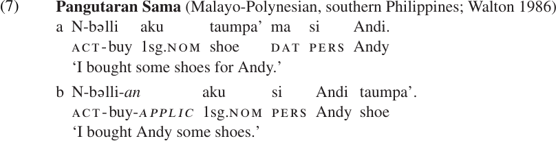 An APPLICATIVE affix is one which increases the syntactic valence of a verb by introducing a new primary object. Typically, the applicative “promotes” an oblique argument to primary object, and so does not affect the argument structure of the verb. If the verb was transitive to begin with, the derived verb will be ditransitive (taking two objects). Pangutaran Sama has a suffix-an which functions in this way, as illustrated in (7). The basic transitive verb (N) bəlli ‘buy’ can take an optional oblique beneficiary marked with ma ‘dative.’ When the applicative suffix is added to form N bəlli-an, the dative case marker is lost. There is also a change in word order, with the NP that expresses the beneficiary appearing before the patient NP.