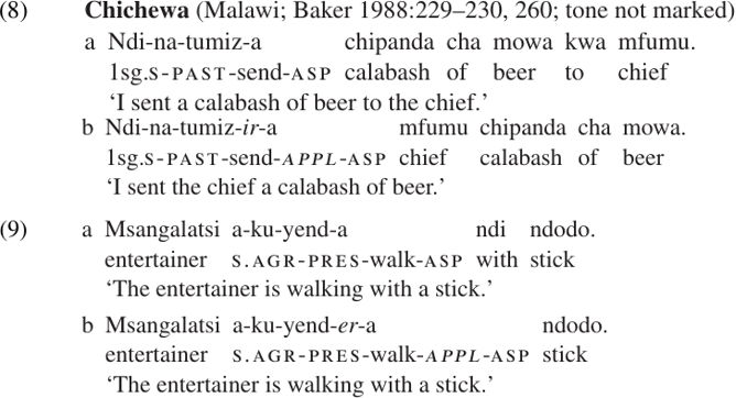 Many African languages have applicative affixes, including the Bantu language Chichewa. As the examples in (8–9) illustrate, the promoted oblique argument may be a recipient or instrument; benefactive and locative uses are also possible, but are not illustrated here. In Chichewa the oblique arguments are marked with prepositions (kwa for recipients; ndi for instruments). When the applicative suffix (-ir∼-er) is added to the verb, this argument becomes the primary object and is expressed as a bare NP.