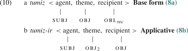 As with the passive alternation, the applicative affixes in these examples do not seem to change the basic meaning of the verb. The same participants are involved in the same type of event in both the (a) and(b) forms, suggesting that the argument structure of the verb remains the same. The effect of the applicative affix is to change the association (or linking) between semantic roles and Grammatical Relations, increasing the number of terms (i.e. the syntactic valence) by one. This change is illustrated in (10), which shows the argument structures corresponding to the sentences in (8). Again, we could express the relationship between the two verb forms with a WFR.