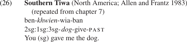 In other languages, however, NI does not reduce the valence of the verb. In (30b), for example, we see that the Mohawk verb continues to agree with its OBJ even when the OBJ is incorporated. If the verb is inflected as an intransitive, agreeing only with its SUBJ as in (30c), the sentence is ungrammatical. Similarly, a transitive verb in Southern Tiwa shows the same agreement pattern whether the object is an independent NP (31a) or an incorporated noun (31b). We will refer to this pattern as valence-preserving incorporation.