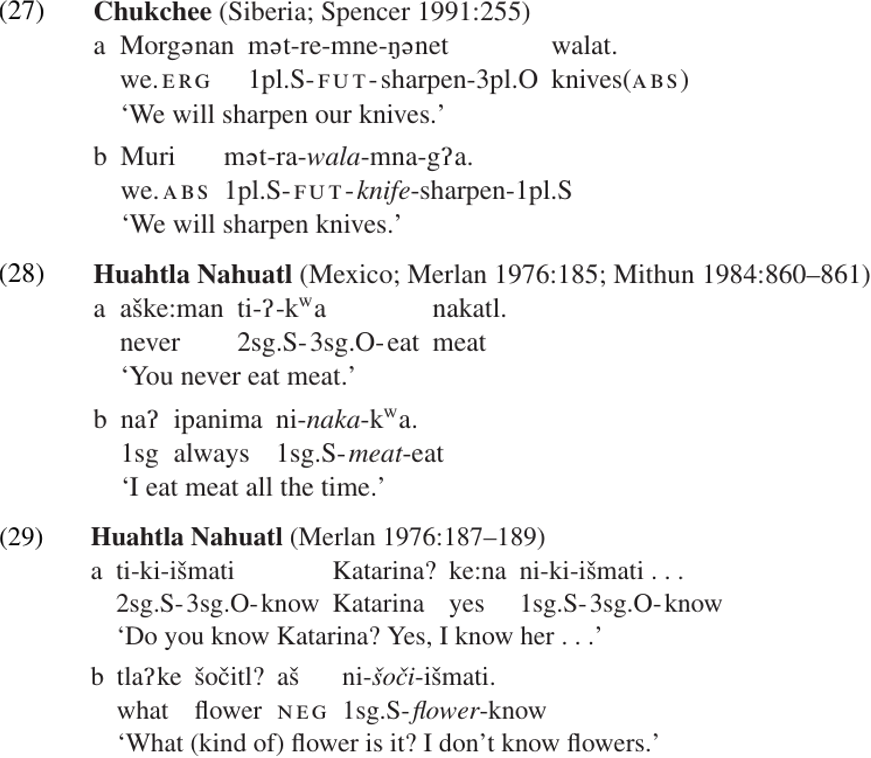 The most common kind if NI is that in which the incorporated noun functions as the object of the verb. Sometimes this results in a decrease in syntactic valence. For example, (27a) contains a transitive verb ‘sharpen’ which agrees with both SUBJ and OBJ. The subject NP gets ergative case and the object gets absolutive case. In (27b) the object ‘knife’ has been incorporated into the verb, so the verb is no longer marked for object-agreement. Moreover, the SUBJ of (27b) is now marked with absolutive case, indicating that it is the subject of an intransitive clause. We will refer to this pattern as valence-decreasing incorporation.11 Further examples of this pattern are given in (28b) and (29b).