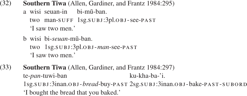 13. Under the analyses proposed by Mithun (1984) and Rosen (1989), the incorporated noun in the valence-preserving examples (30–33) is not the OBJ but only a kind of classifier, which restricts the semantic class of possible objects. Stranded modifiers like those in (31c, 32b, 33) involve a null N as head of the OBJ NP.