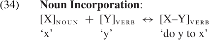 A simple WFR which represents incorporation as a process of N+V compounding is suggested in (34). However, we will not attempt to write specific rules to express the differences between valence-decreasing and valence-preserving incorporation here.