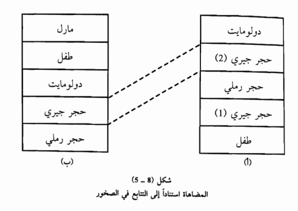 فلو كان لدينا في منطقة ما طبقتان متماثلتان من الحجر الجيري إحداها تقع فوق طبقة من الطفل وتقع فوقها طبقة من الحجر الرملي والطبقة الثانية قد تقع تحتها طبقة الحجر الرملي وفوقها طبقة من الدولومايت كما موضح في الشكل (8 5)، فإن هذا التعاقب لطبقات صخرية تتوضح منه أهمية الموقع في التتابع الطبقي في المضاهاة ولذا فإن مضاهاة الحجر الجيري الذي أشرنا إليه برقم (2) المقطع (أ) سيكون مع الحجر الجيري في المقطع (ب) واستبعدنا احتمال كون الحجر الجيري في (ب) هو الحجر الجيري (1) وذلك لأن التتابع (وليست الصفة الصخرية).