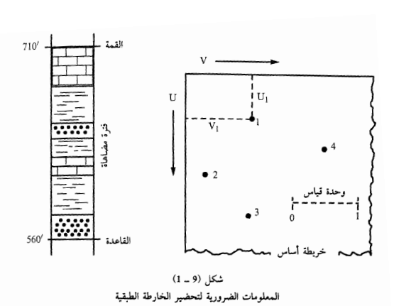 يبين الشكل (9 - 1) بصورة مختصرة المعلومات الضرورية لتحضير أو رسم الخارطة الستراتغرافية. إن الخارطة الأساسية على اليمين ثبت فيها عل كل نقطة سيطرة بئراً مكشف صخري أو مقلع أو أي شيء آخر يظهر فيها ولها رقم معين أو أحدثياتها الجغرافية مثبتة بشكل ما إن استعمالها كأحداثيات على الخارطة سنوضحه فيما بعد إن النقطة الأساسية يجب أن يكون لها موضع ، جغرافي معلوم على اليسار في الشكل (9 - 1) يبين مقطع طبقي مقاس ارتفاع السطح الأعلى والسطح الأسفل للمقطع إضافة إلى نوعية الصخور المبينة وسنشير إلى هذا الرسم الأساسي كثيراً عند دراسة الأنواع من الخرائط الستراتغرافية يلاحظ في المناطق التي حصل فيها تقلص ملحوظ في القشرة الأرضية بأن المواقع الحالية للظواهر التكتونية والجيولوجية تختلف عن المواقع الأصلية لها لمثل هذه المناطق تحضر خارطة أساسية ترجع الظواهر الموجودة في الوقت الحاضر إلى مواقعها في زمن محدد في الماضي الجيولوجي.