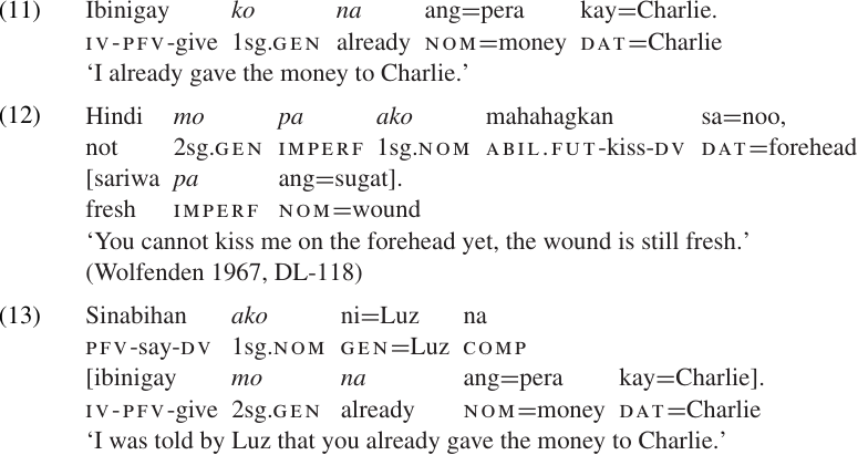 Tagalog has a number of particles which must occur as the second element of their immediate clause. These particles include nominative and genitive pronouns, question markers, aspectual particles, various markers of speaker’s attitude, evidentials, etc. Normal word order in Tagalog is verb initial, so these clitics normally occur immediately after the verb, as in (11). When a negative or other adverbial element appears in pre-verbal position, as in (12), the clitics also precede the verb. And in sentences which contain two clauses, the clitic elements of each clause occur in second position within that clause (12–13).