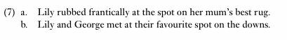 In example (7a), spot designates an area on the rug that has inherent boundaries perceived within the visual field. We know that if we spill something on a rug, the stain has ‘edges’. On the other hand, spot in (7b) does not designate an area with inherent or readily perceivable boundaries. Instead, bounding is imposed upon the area by construal.