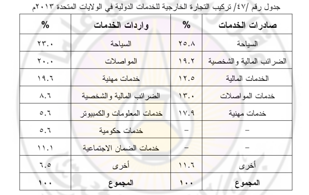 أما واردات الخدمات السياحية فحققت نحو 105 مليار دولار، أي بنسبة 23% من إجمالي واردات الخدمات الدولية للولايات المتحدة، ويليهـا خـدمات المواصلات بنسبة 20% ، والخدمات المهنية 6. 19%، ويتوزع الباقي على خدمات الضمان الاجتماعي والضرائب المالية وخدمات المعلومات والكمبيوتر والخدمات المالية وغيرها.