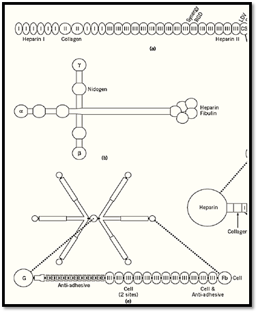 Figure 4. Composite of six examples of cell adhesion molecules of the extracellular matrix: (a) Fibronectin, (b) LamininVitronectin, (d) Thrombospondin, (e) Tenascin, (f) Nidogen (entactin). These molecules vary widely in size and shape, aorganized into functional binding domains. Specific molecular or cell-binding sites are labeled.