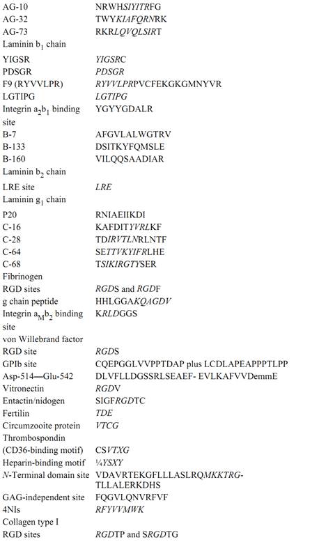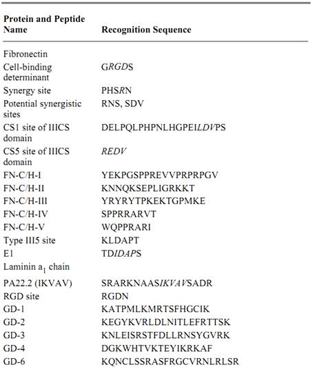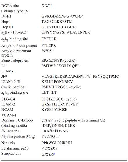 A striking characteristic of a number of cell adhesion molecules is their frequent use of short peptide recognition sites (Refs. 18, 23-25, 29-31 and references cited therein). Short peptides with these sequences can at least partially mimic the binding function of intact molecules to adhesion receptors. Examples include Arg–Gly–Asp (RGD) and Leu–Asp–Val (LDV), which can bind directly to certain integrin receptors. Nevertheless, binding can be 25- to 200-fold more active in larger peptides or proteins, such as in association with a “synergy” site that functions synergistically with the primary adhesive peptide site (30). Some peptide recognition sites appear to be “cryptic” in the intact molecule, and may be active only in small fragments of the protein, such as after proteolysis. Table 1 lists the putative peptide recognition sequences in cell adhesion molecules. It is important to stress that a number of adhesion molecules also function by adhering to other proteins over much broader intermolecular contact areas, via multiple molecular contacts and with no simple peptide motif, in analogy to classic high affinity noncovalent protein–protein interactions (19). It is nevertheless striking that so many cell adhesion molecules use simple, specific, peptide adhesive-recognition motifs.
