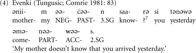 In the following example from the Tungusic language Evenki, the complementizer is an accusative case marker (ACC), that is, the complement clause is introduced by a case suffix, in accordance with (3a), the verb @m@ ‘come’ of the complement clause is presented in the resultative participle (PART), cf. (3b), and the agent of the complement clause appears as a possessor suffix (-s ‘your’) on the participle form of the verb (cf. (3d)).
