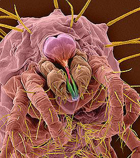 2- ليس للاكاروسات اعين مركبة. قد يكون له زوجان من الاعين البسيطة بالإضافة الى عين وسطية. ليس للحلم او القراد من أعضاء الحس الأخرى سوى شعيرات للشم التي توجد على الرسغ.