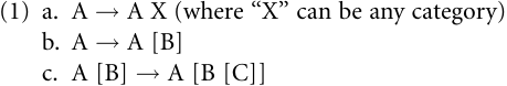 In its most general form, recursion can be said to be present when some constituent occurs within another constituent of the same type. For instance, a noun phrase can appear within another noun phrase (John’s wife, or the book on the table) or a clause within another clause (Jane is the woman that John loves). It can be represented with a rule like (1a), which contains the same symbol on both sides of the arrow and thereby produces an environment for its own reapplication.