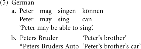 There are considerable typological differences with respect to this distinction. First, a given language may allow recursion in some specific domain of grammar where another language does not. In German there is simple recursion with modals, cf. (5a), where English has no recursion. On the other hand, German speakers have only simple recursion with inflected genitives, cf. (5b), where English speakers do not have such a constraint, as the English translation of (5b) shows.
